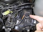 - Locate the speed sensor (finger is pointing to it in this photo). Note the wires exiting the actual sensor are brown but after the connector they are black or light green. The latter are the wires I'll be referring to through this instruction. The photo shows the three wires already unwrapped from their electrical tape and separated, ready to cut or splice. The wire code is: