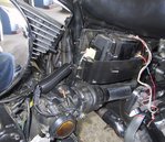 - It's time to figure out where you'll be stashing the Yellow Box. As it happens (even on California models) there is plenty of room under the left cover. Note mine is a California bike so has the charcoal canister under the cover and that's what you see behind the yellow box. I drilled a 3/8" hole through the backplate and ran the yellow box wiring harness out through that hole. Don't worry about sealing it up just yet, we'll do that later.