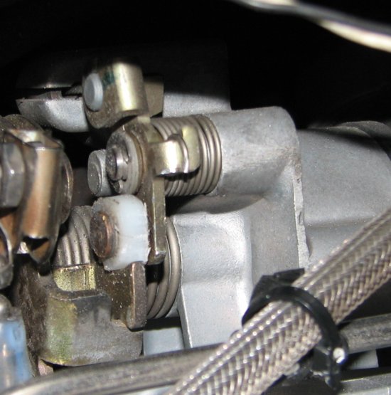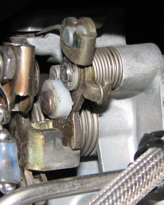 Take a look at the photo left. This is with everything in normal running position (fast idle knob pushed in).Notice how the top has been filed off and also the bottom. This is something you do a little at a time until the nylon clears the fast idle lever. If you don't do this you'll end up with a very fast idle even with the knob pushed in.