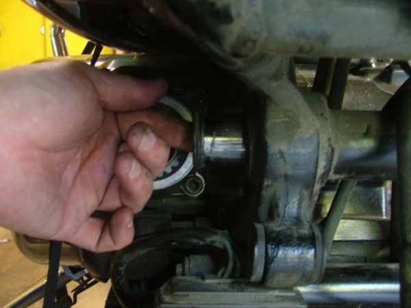of the swing arm and loosen the swing arm bolt. When the bolt is loose, support the swing arm and remove the bolt towards the right side of the bike. Gently pull the swing arm towards the rear of the bike and the drive shaft will stay attached to the transmission as shown at left.Again, take care as not to jar the u-joints. There will be three spacers for the swing arm One (l) long one, in the middle and two